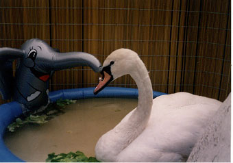 Anschließend braucht der Schwan viel Ruhe, einige Salatköpfe täglich, und täglichen Wasserwechsel in seinem provisorisch aufgestellten Kinderplanschbecken. Die Reling, auf der er nun residiert, wird während seiner Genesungszeit, sehr selten und nur in Zeitlupe betreten. Denn er regt sich gerne auf, wenn sich ein Fremder nähert, und läuft Gefahr, aufgescheucht gegen ein Hindernis zu rennen, und sich erneut zu verletzen. Nach ein bis zwei Tagen, hat er sich etwas beruhigt. Nun dauert es nur noch fünf bis zehn Tage, bis er sich wieder auf den Weg macht.